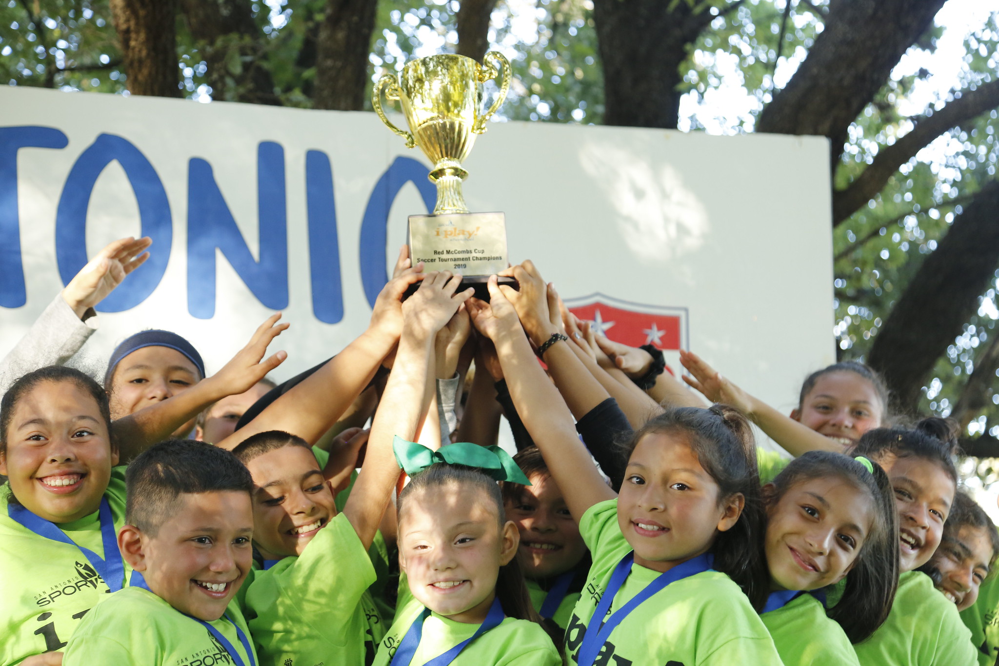 It was a beautiful day when 1,400 students in San Antonio Sports’ i play! afterschool program came to show off their newly developed soccer skills at a special tournament. After a long day of play, Briscoe Elementary came out on top, earning the Red McCombs Cup, named after the i play! afterschool supporter. Pershing Elementary came in second and Fox Run Elementary was third. Students representing 58 elementary schools in five school districts participated. Thanks to the Harvey Najim Family Foundation, each participant has received an i play t-shirt, shorts and socks, and received shoes and a backpack at the tournament. Congratulations to all the teams for their sportsmanship and giving it their best! To see pictures from the day, view gallery here.