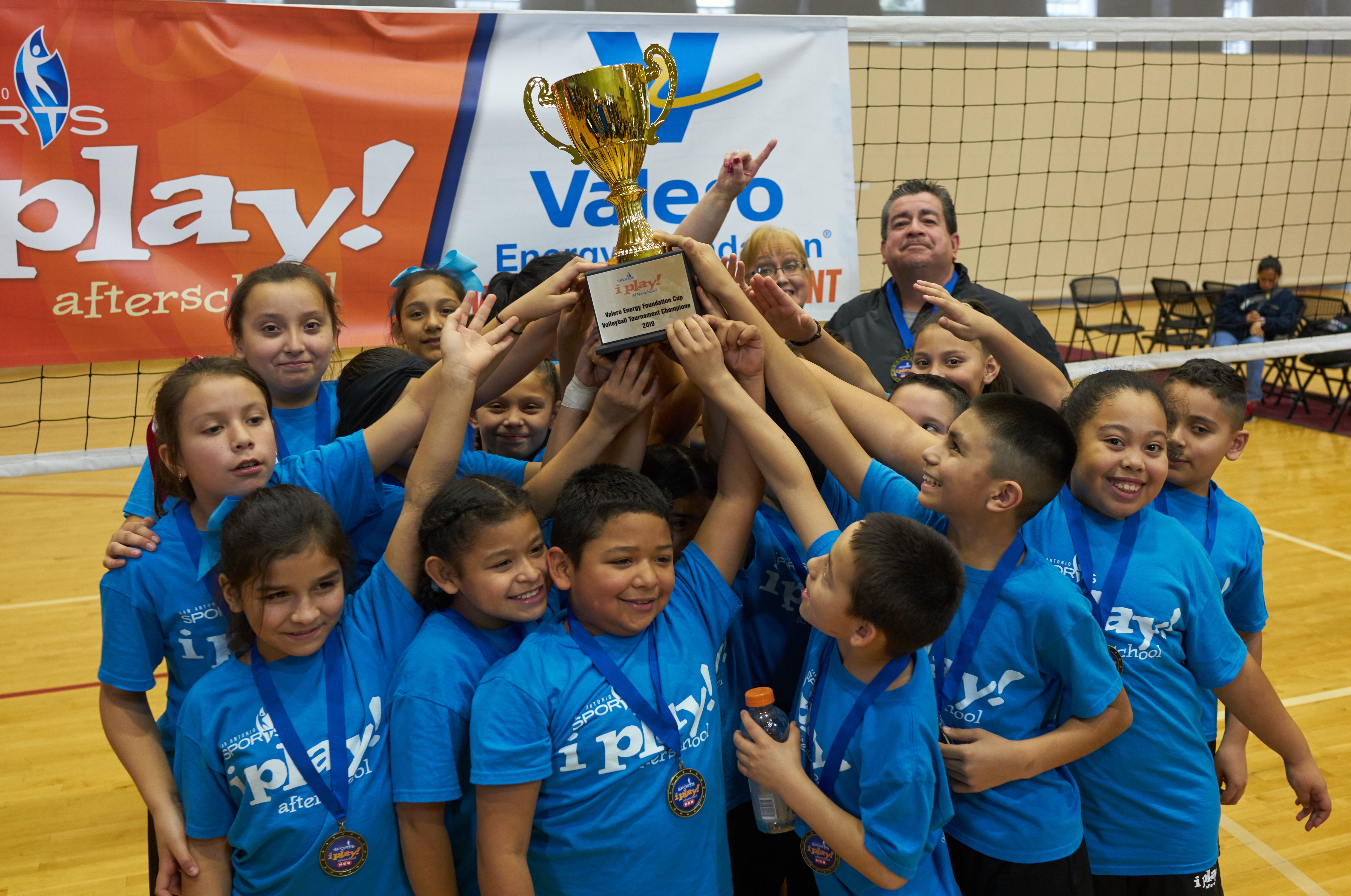 It was a great day of play! After a five week unit of volleyball, athletes in San Antonio Sports i play afterschool program participated in a program-wide tournament held at Mission Concepción Sports Park. Congratulations to Briscoe Elementary who won the Valero Energy Foundation Cup. Bellaire Elementary came in second and Wilson Elementary was third.