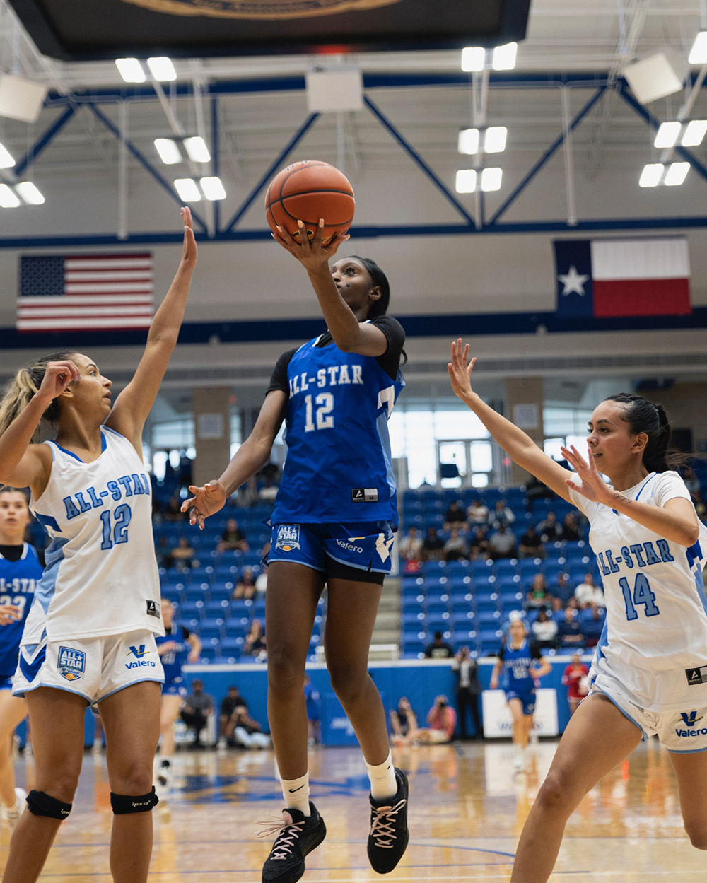 Team White handled Team Blue, 77-40, in the Girls 1A-5A San Antonio Sports All-Star Basketball Game. Team White made their presence felt early, opening the game on a 13-1 run and limiting Team Blue to just one made field goal in the first quarter. Team Blue responded by scoring eight points in the first five minutes of the second period. Nevertheless, Team White entered halftime with a 30-13 advantage. Both teams had their best scoring quarters in the third, but Team White opened the second half on a 12-3 run and never looked back. Team White outscored Team Blue 38-to-8 in the paint, and 24-to-4 in fast break points, proving to be the difference maker in the game. Alisha Peavy’s 13 points led the way for all scorers, earning her Impact Player of the Game.