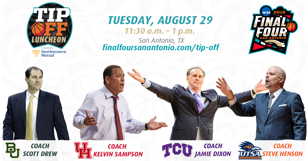 SAN ANTONIO, Aug. 10, 2018 – The San Antonio Local Organizing Committee (SALOC) has teamed up with NCAA corporate partner, Northwestern Mutual, to tip off the Road to the Final Four® with a luncheon presenting top NCAA Division I Men’s Basketball coaches from around the state.