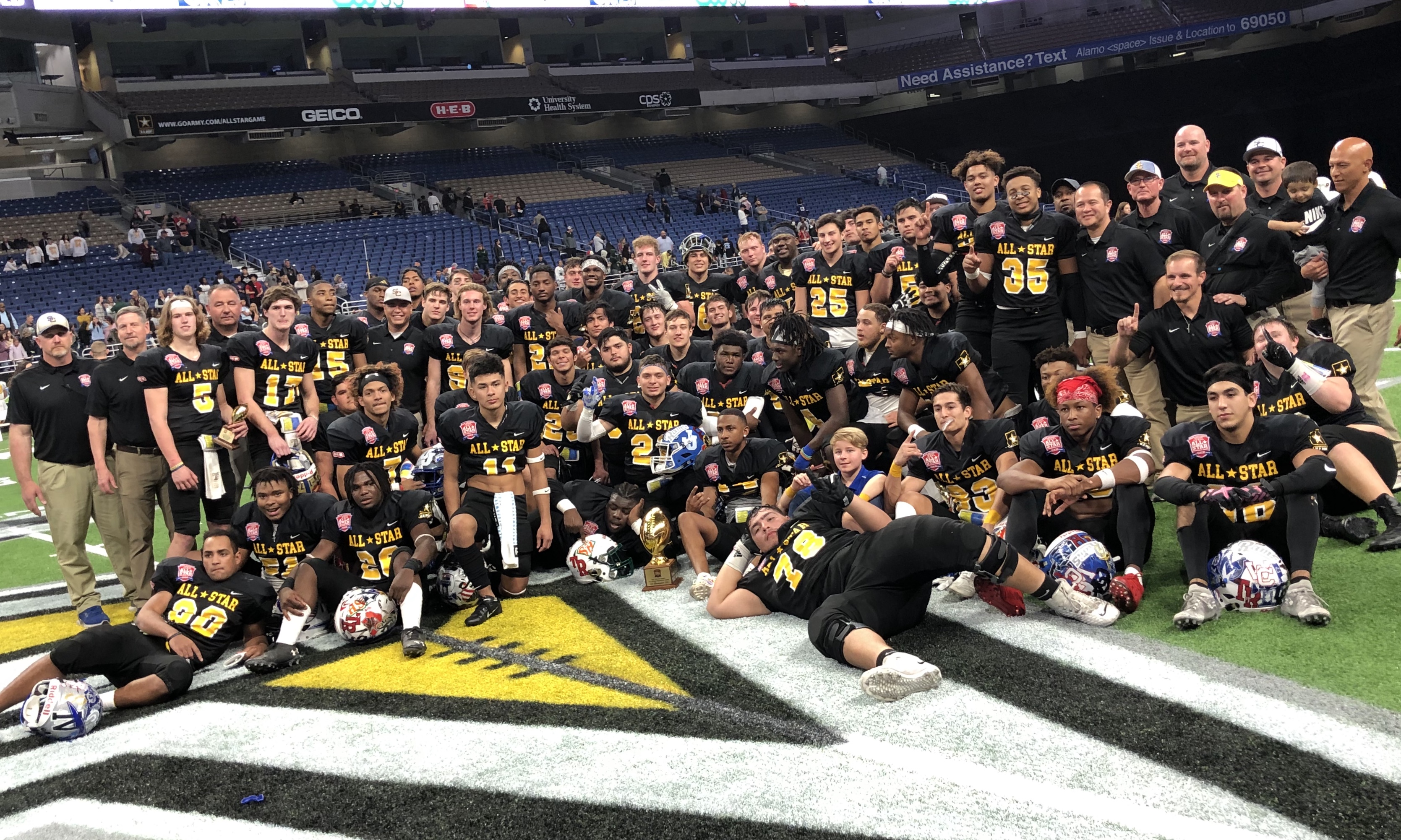 Congratulations to Team Black who won the 2020 San Antonio Sports All-Star Football Game presented by H-E-B. The game was a thriller, going right down to the wire. Kerrville Tivy’s Trapper Pannell threw for two fourth-quarter touchdowns as Team Black rallied past Team Gold 35-34 before 18,242 at the Alamodome. Pannell was named Whataburger Impact Player of the Game.