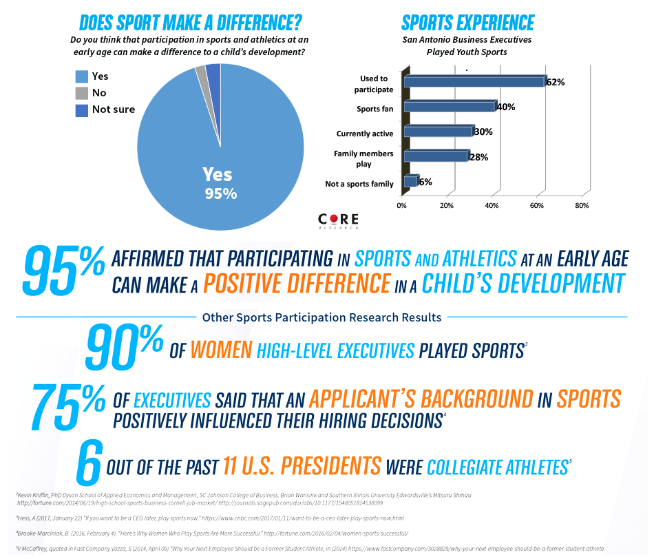 On behalf of San Antonio Sports, Core Research polled 330 San Antonio-area business owners and C-suite executives, men and women, in the fall of 2018 and received affirming news: Over 60% of business leaders participated in sports in their youth, reinforcing the view that there is a relationship between youth sports and career success.