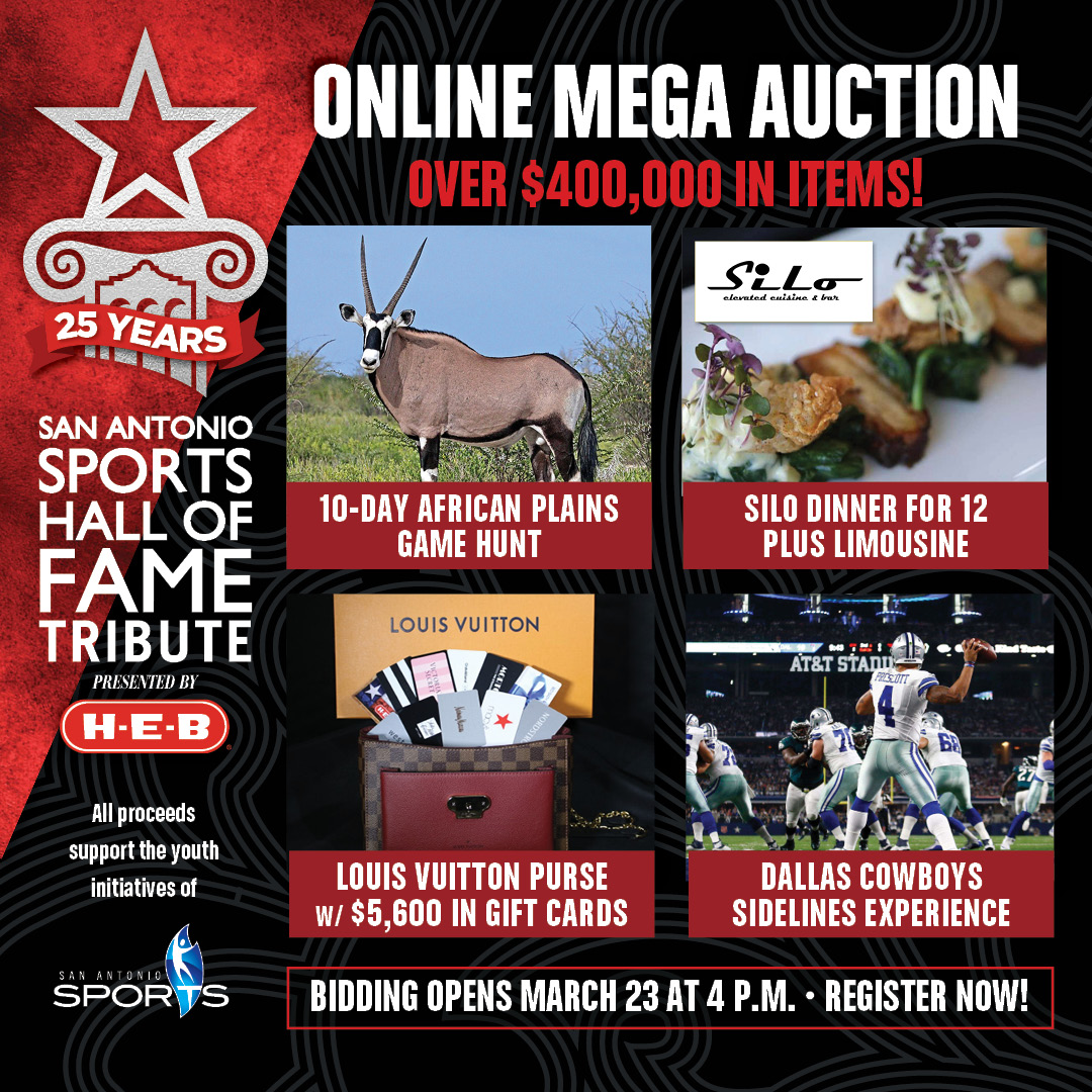 As we all work through these very challenging times, I hope that you will help us turn lemons into lemonade. To alleviate some of the lost income, we have taken our San Antonio Sports Hall of Fame auction online. Please click on this link and you’ll find hundreds of items to bid on, including gift cards, restaurants, jewelry, travel packages and an extensive selection of sports collectibles. The online auction will continue through Friday, April 3.